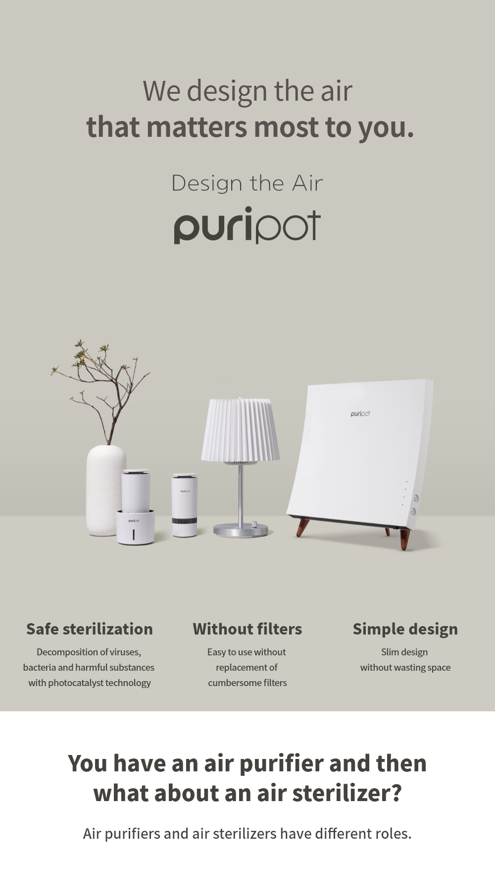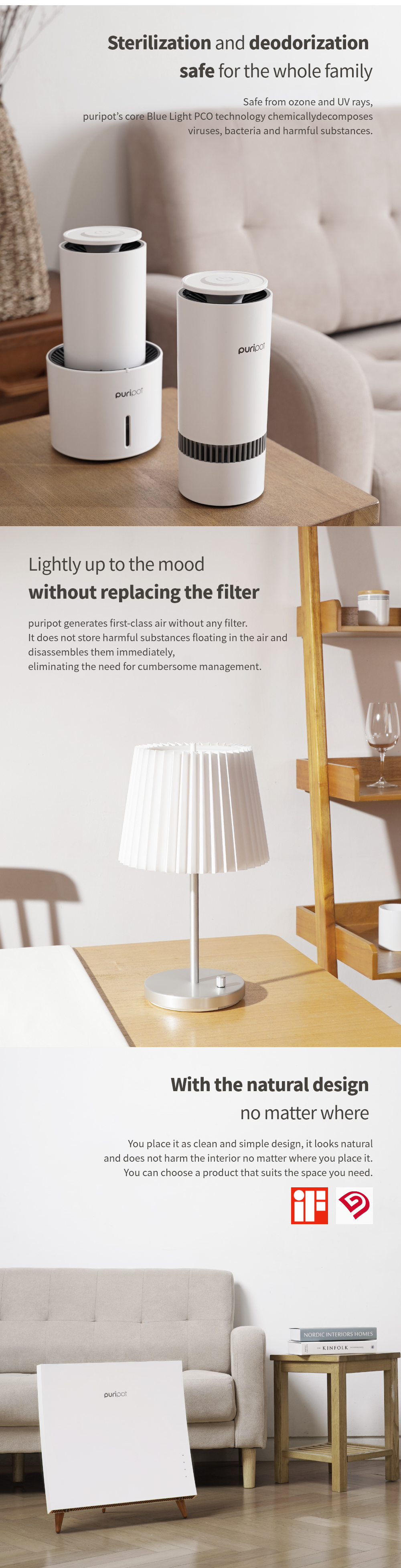 The Puripot L Series is a mobile usage air sterilizer with the latest blue light PCO technology. You can adjust the brightness with 24 LEDs to suit the shape of the lamp and make the mood of the space.